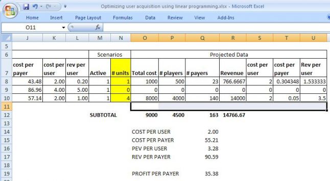 Once you have decided what your metric is that you want to optimize, you can point the Excel solver to it. This screenshot below shows the Solver Dialog with the setting of minimizing "cost per paying user" which is cell Q15.